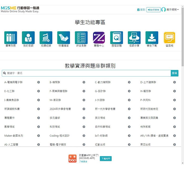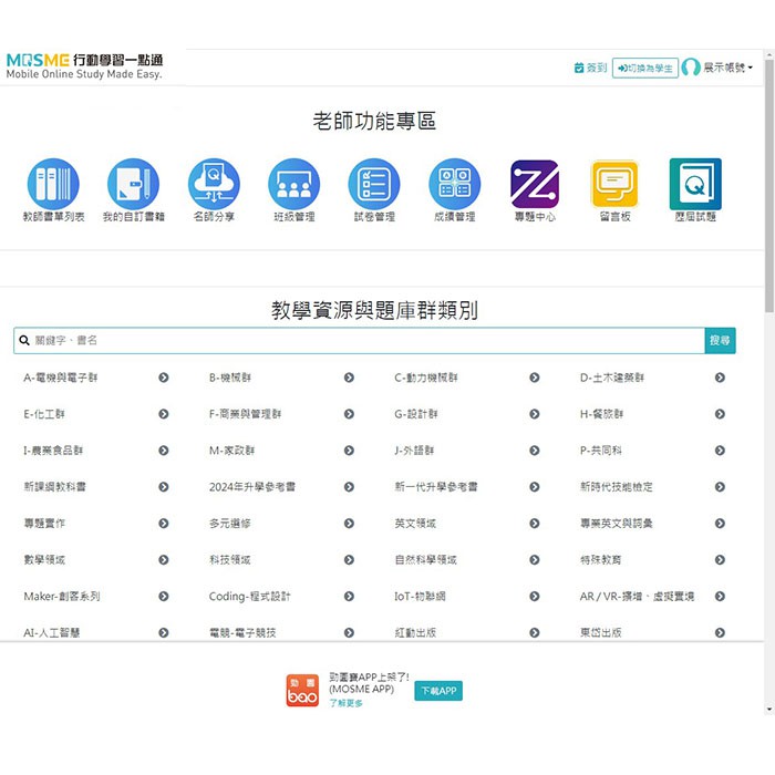 一、教師書單列表:教師針對書籍下載授課所需資源檔案、製卷命題、發布公告通知課程訊息或分享檔案給學生