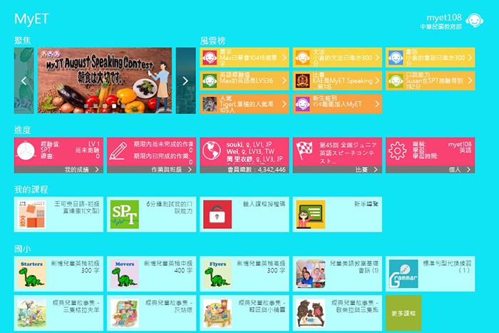 透過 MyET,學生們可以參加 MyET 所舉辦的各種國際性線上英語口說競賽,而各個學校也可以舉辦自己的英語口說競賽。學生們可以重複參賽,而且在完成比賽後,會馬上看到自己的世界排名,在類似遊戲的情境中增強自己的英語實力。