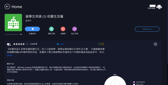 (4) 在課程介紹頁面,點選課程目錄,選擇〝FREE〞字樣單元進行試用