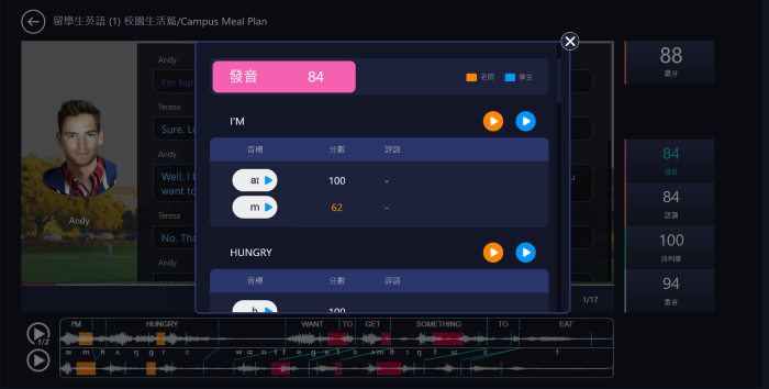 MyET 會針對學生的「發音」、「語調」、「流利度」及「音量」給出精確的分數,並告訴學生問題出在哪一個字、哪一個音節,然後再告訴學生如何做改進。