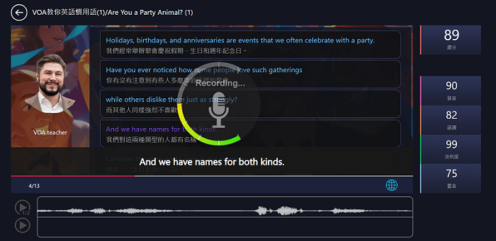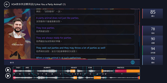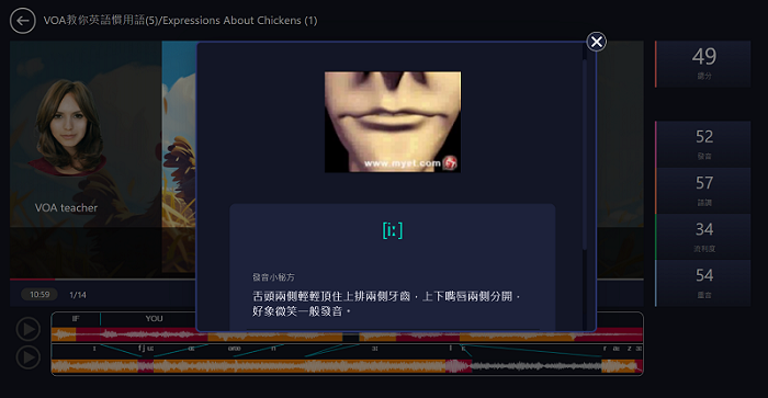 MyET 會針對學生的「發音」、「語調」、「流利度」及「重音」給出精確的分數,並告訴學生問題出在哪一個字、哪一個音節,然後再告訴學生如何做改進。