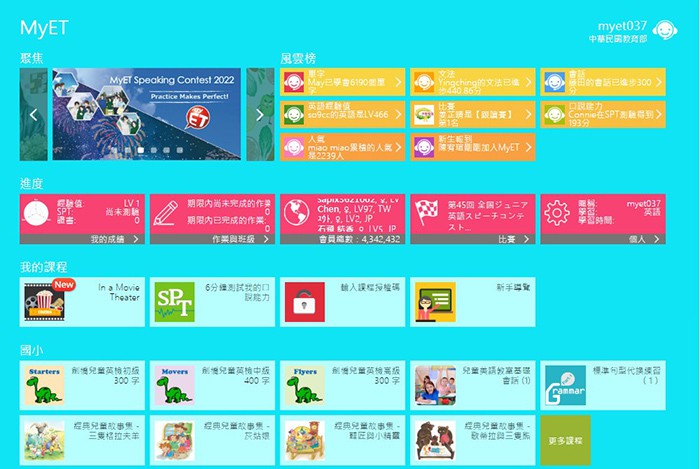 透過 MyET,學生們可以參加 MyET 所舉辦的各種國際性線上英語口說競賽,而各個學校也可以舉辦自己的英語口說競賽。學生們可以重複參賽,而且在完成比賽後,會馬上看到自己的世界排名,在類似遊戲的情境中增強自己的英語實力。