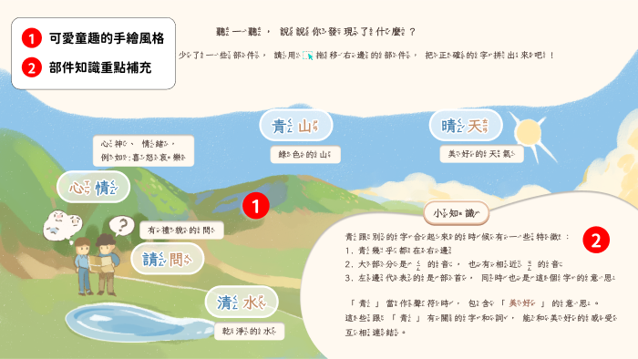 • 部件的拆解與延伸活動,讓孩子們輕鬆理解國字的結構和含義,就像探險一樣發現造字的祕密。