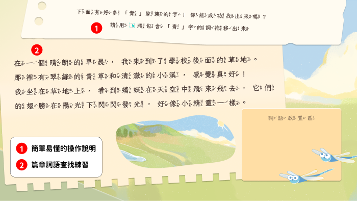 • 故事帶領著學生探索島嶼,尋找國字部件與發音之間的關係,並能學習歸納其規則。