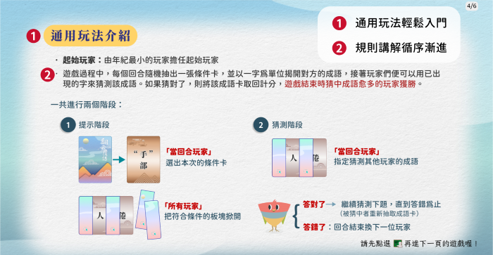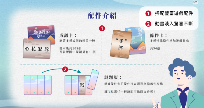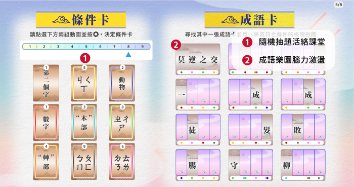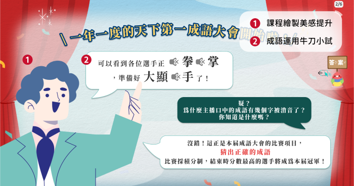 以 myViewBoard 科技軟體為載體,將既有教具數位化,並加以結合腦力激盪、分組競賽等模式,幫助學生快樂遊戲學習成語運用。教材內容特色如下: