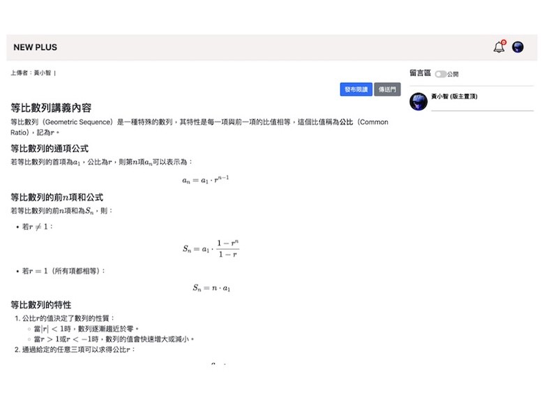 短文(Markdown)創作模組,教師可直接編寫、儲存與發布教學相關的短文或公告,並支援多種格式的內容嵌入,例如:圖片、影片與數學公式。