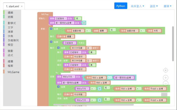以積木式程式設計來降低入門門檻,並利用 2D MLGame 來激發 AI 學習趣味性