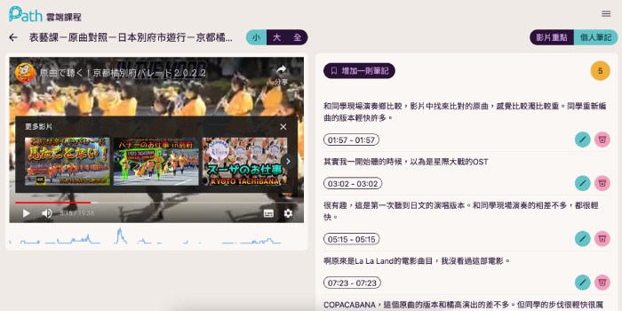 同時亦可輸入個人時間筆記,掌握影片重點。