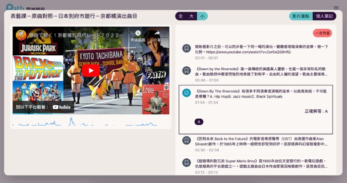 找到合適的Youtube影音資源,建立時間點筆記,提示學生學習重點。