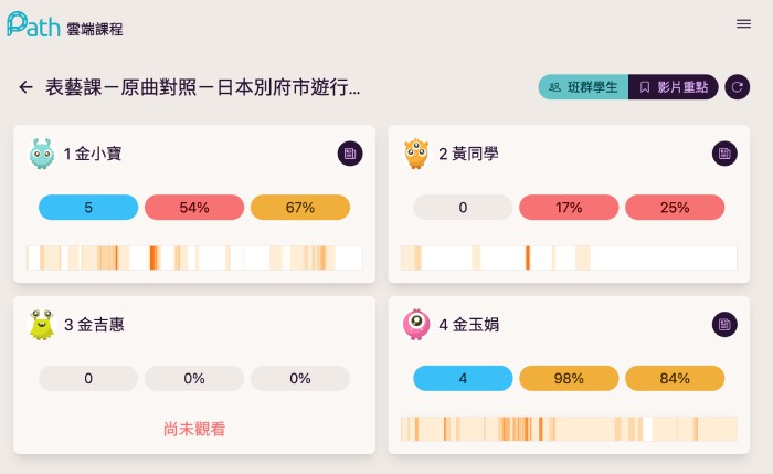 學生有沒有看?看了多久?看了幾次?有沒有不懂的地方?以前聽學生描述,只能概括了解,最後以考試分數總結學習成果。其實學習過程的行為,讓老師不用等考試的結果,就能更快發現問題,引導學生突破困境。