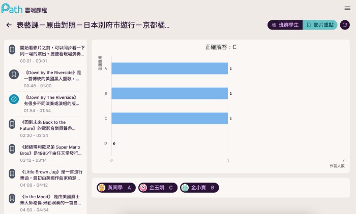 提供老師針對Youtube影片進行重點標註及問答題編輯,問答題提供「一次回答」及「多次回答」兩種回答方式。在編輯完成後的教材,可透過Path、Oha或Google Classroom 指派給課程參與學生。