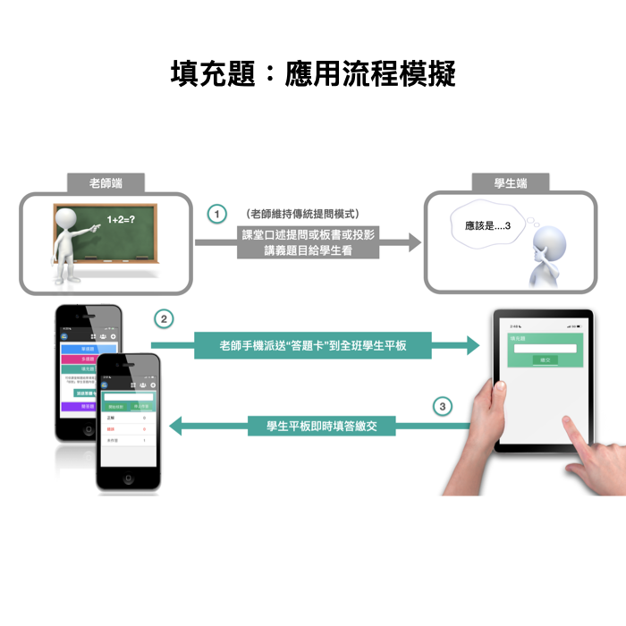 *老師板書➜搭配手機派送空白答題卡➜學生平板接收選填繳交