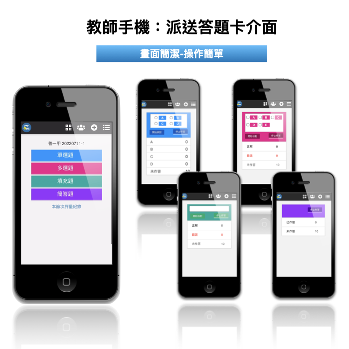 *投影PPT/PDF/DOC/影音➜搭配手機派送空白答題卡➜學生平板接收選填繳交