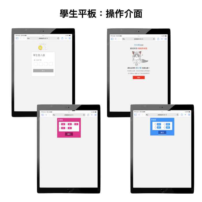 *學生端手機/平板登入連線後畫面受老師控制為『等待』或『答題』狀態,讓學生的手機/平板變身為單純的『答題輸入器』。
