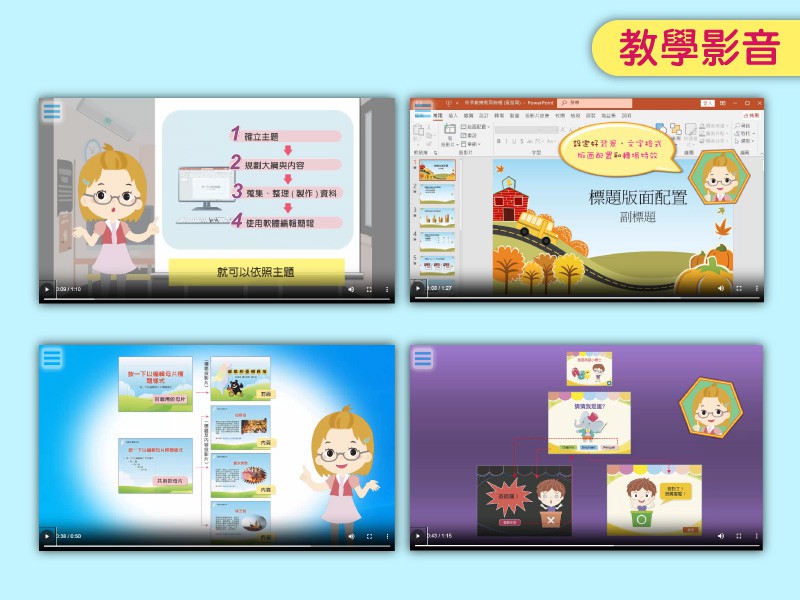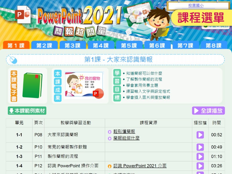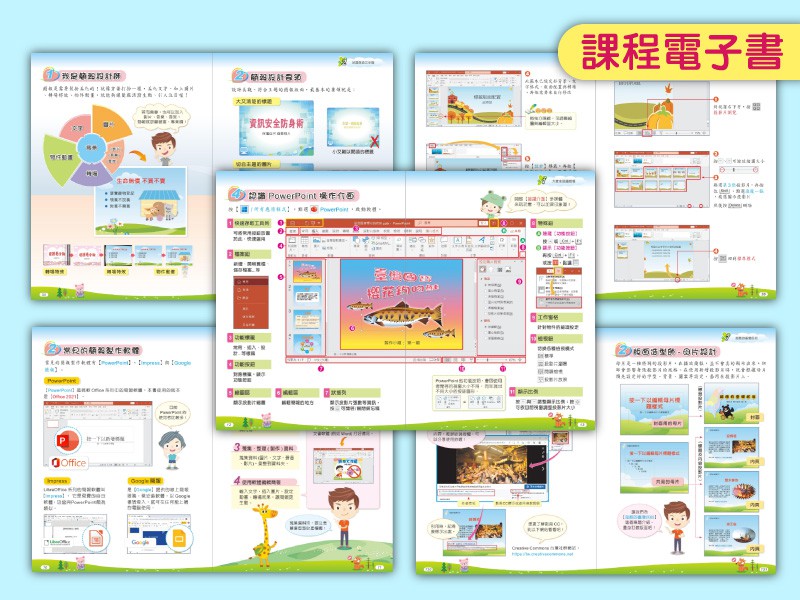 電子書內容,搭配圖示化步驟教學,趣味、實用、成就並重,練習有自我介绍簡報、動態影音相簿、SmartArt與網頁超連結、四格動漫製作、互動答遊戲、母片應用、專題報告…等,能達到生活與資訊技能教育的目的!