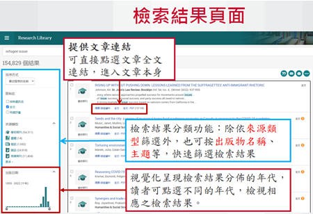 2. 全文期刊主題包括 : 公共衛生、心理學、生物科技、商學管理、工程學、地球科學、政治科學、法律資源、國際關係、經濟教育、醫護健康、歷史考古等等,提供高年級學生利用文章撰寫小論文。