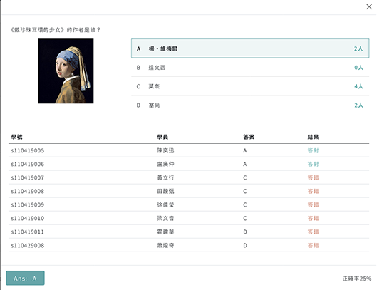也能於測驗進行中檢視作答率、測驗後即時反饋作答成果