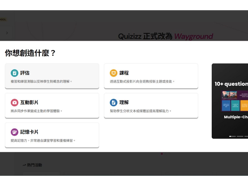 Wayground 是一款可以讓建立評估、指導和練習活動變得容易的學習程式,達到進而激發每一位學生的學習興趣和專注度的作用。同時也是一個線上學習平臺,讓老師可以創建、編輯、共享自己的問答遊戲,讓學生可以在課堂上或在家中透過手機、電腦等裝置參與學習。Wayground的問答遊戲可以用於各種學科和主題,老師可以根據自己的教學需求自由創建問答遊戲現今,全世界許多老師都在使用這項平臺,已經建立並分享了超過三千萬個學習活動。