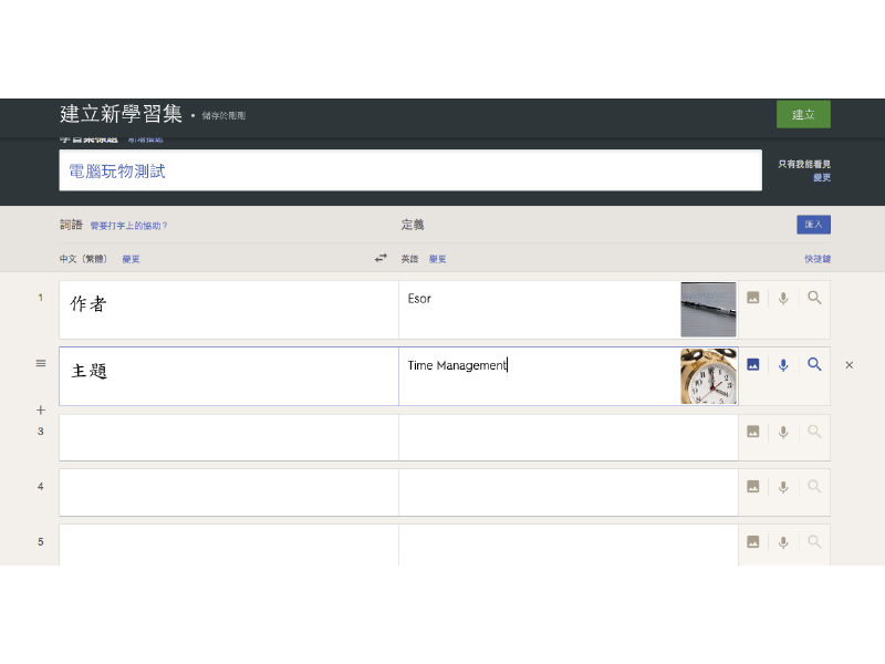 Quizlet 上面已有許多使用者建立、不同語言和主題的學習集。老師也可以打出版社名稱來搜尋,例如學生用南一版英語課本時,只要在關鍵字輸入「南一」,就可以找到許多學習集。如果找不到理想的學習集,Quizlet 也能透過「預測字詞」和「建議圖片」等功能來快速建立學習集。
