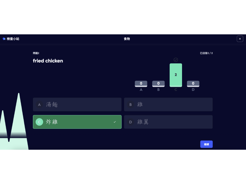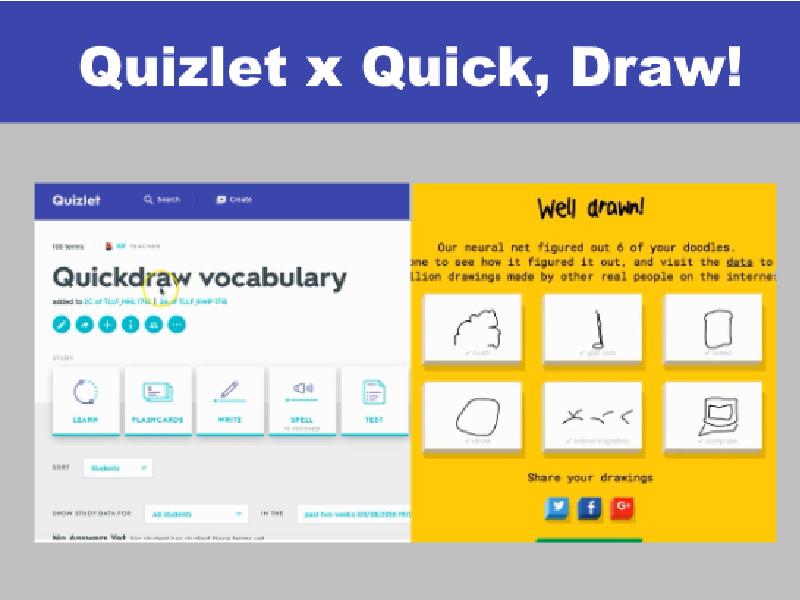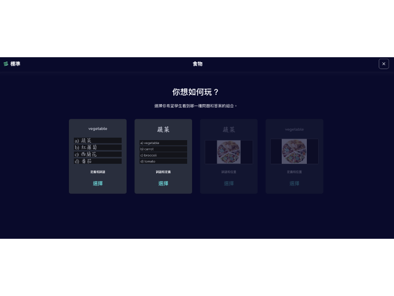 建立學習集後,除了方便瀏覽,學生還可以透過遊戲來複習單字。目前 Quizlet 上有七種不同測驗方式可以複習,包括對對碰、消滅來襲石塊等。
