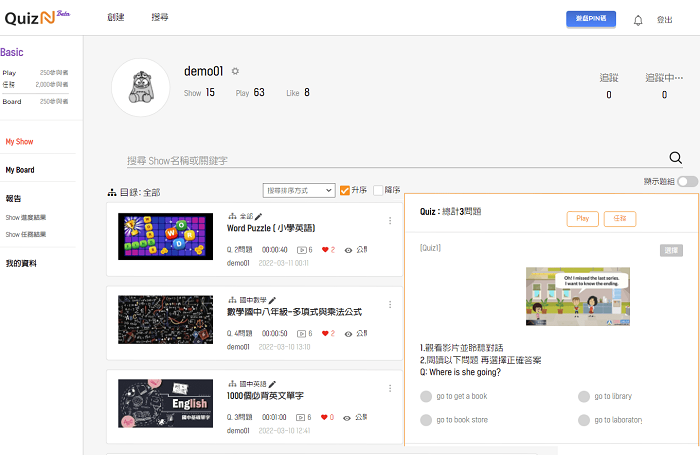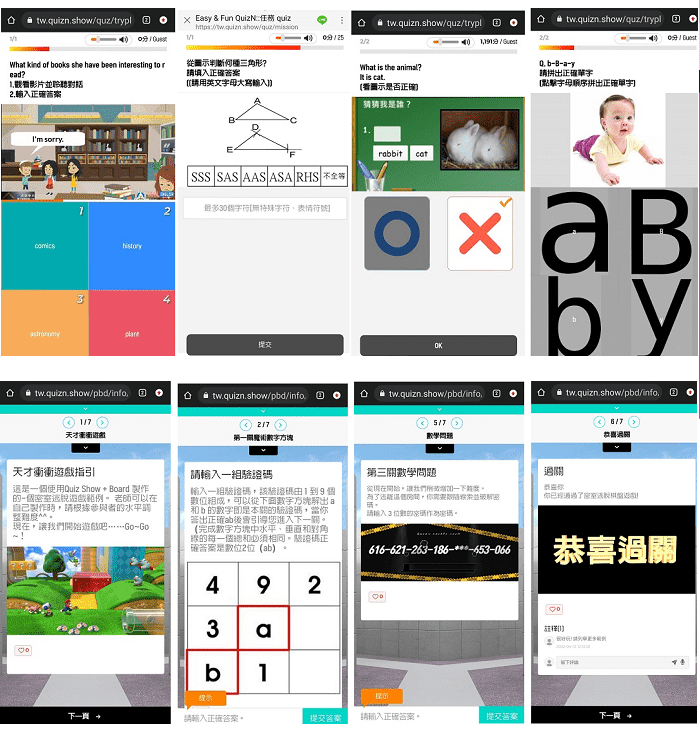 Quiz Show:(1)提供10種出題模式 ; (2)支援混合不同題目類型的出題; (3)互動遊戲問答競賽出題; (4) 可使用URL影片 (YouTube ) 並設定僅播放影片的特定區間部分、可使用語音(MP3)檔案和錄製聲音; (5)使用影音類型時,可以查看學生觀看影音的進度; (7)現場即時搶答(面對面) 測驗題幹和選項僅顯示在主持人的螢幕由,主持人控制節奏,提供講解的空間 ; (8)自行答題(非面對面); (9)任務模式設定的時間內完成指定作業、設置是否重試、是否顯是答案..等多種選項。 * 現場即時搶答遊戲參與者:最多250人* 任務模式參與者:最多2000人