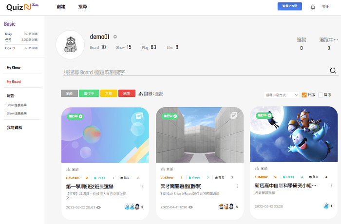 Board:(1)提供多9種共作分享看板模板; (2)支援混合不同類型的模板使用 ; (3)能夠創建多頁(不同主題)模板; (4)支援互動式白板書寫功能 ; (5)使用密室逃脫模板創建密室逃脫遊戲 (解決謎語,線索和難題的序列來破解代碼) ; (6)使用挑戰類型模板創建團隊任務遊戲 ; (7)即時共同討論、班級作品展示牆(牆壁磚類型); (8)分組作品成果發表(群組類型模板); (9)學習資料提交收集和班級意見留言板(收集和詞雲類型模板的使用),提供各種發布選項工具,支援圖像、影音、繪圖、聲音/錄音,是否發布顯示和是否須審批功能。
