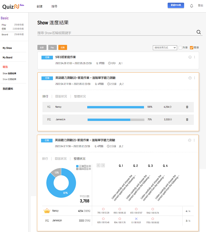 結果數據分析(Web & Excel),互動即時線上測驗參與歷史紀錄、播放紀錄、答題的記錄,共作分享看板參與歷史紀錄。My Video 參與歷史紀錄。