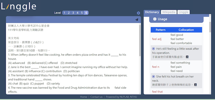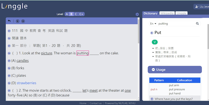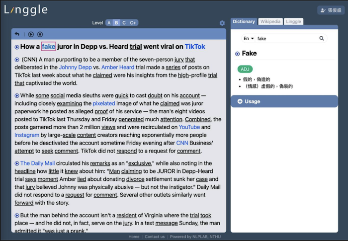 R Linggle 的特色包括可以用多元的方式 (網址、剪貼、照相掃描輸入) 輸入適合使用者興趣愛好、難易程度的內容文字。例如,老師、同學們可以用來讀英語學習雜誌 (如空英、常春藤等) 。遇到不懂的生字 (例如:barrel),R Linggle 會運用人工智慧分析前後的主題 (例如:容器或武器),就可以提供生字解釋 (例如:酒桶或是槍管)。