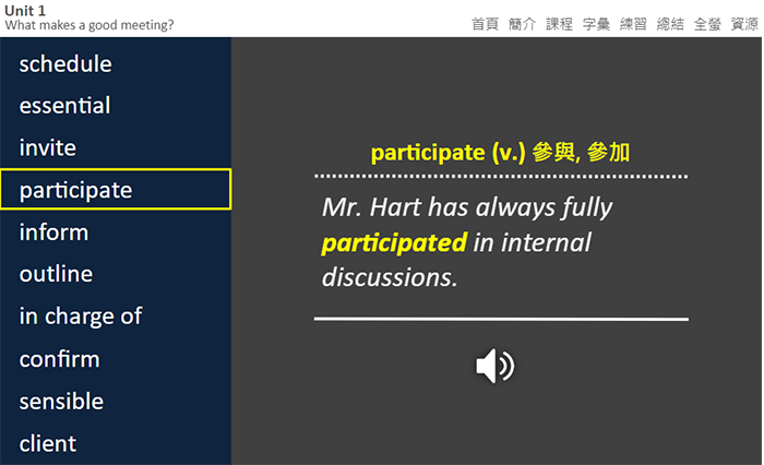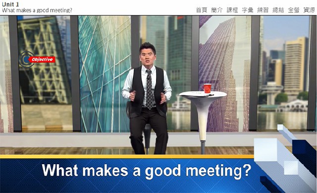 Meeting主題教學內容涵蓋三大部分會議準備、高效會議及要點補充合計共15課(Unit)。