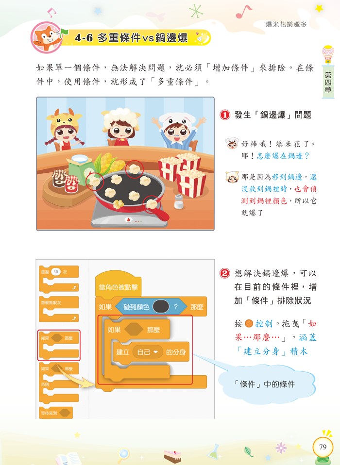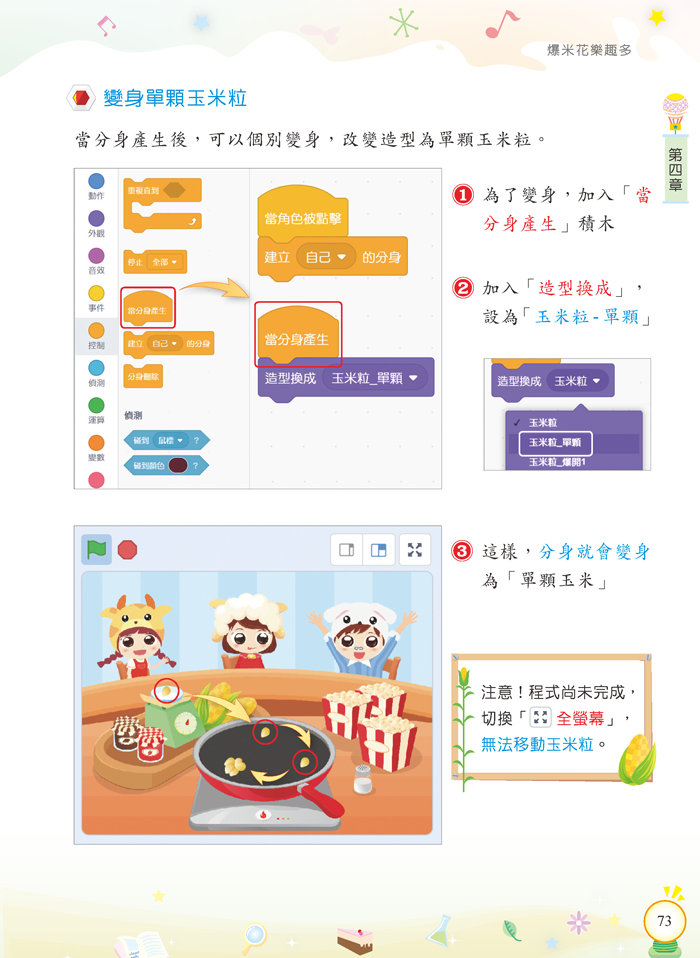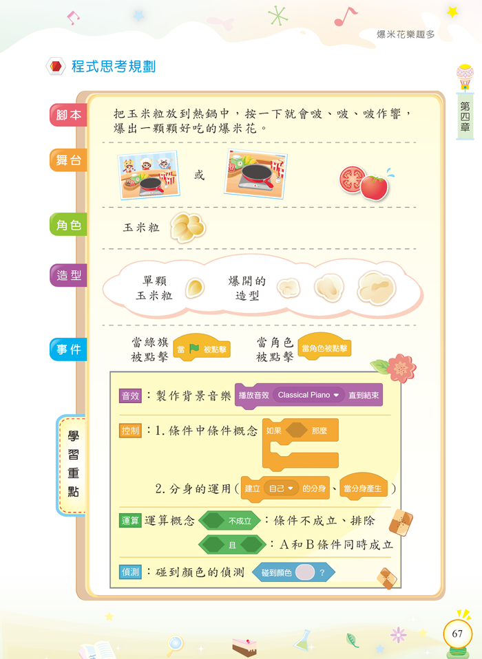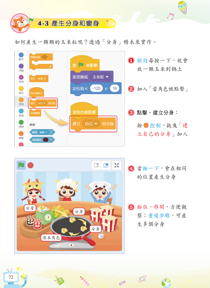 著重角色互動,搭配背景轉場特效,製作「預防流感」動畫簡報程式。土撥鼠找朋友,增加「限時挑戰」,學習撰寫趣味創意遊戲;棉花糖射擊遊戲,從闖進棉花糖世界,運用滑鼠移動、射擊,搭配隕石和生命值,學習整合創造、自己寫程式。