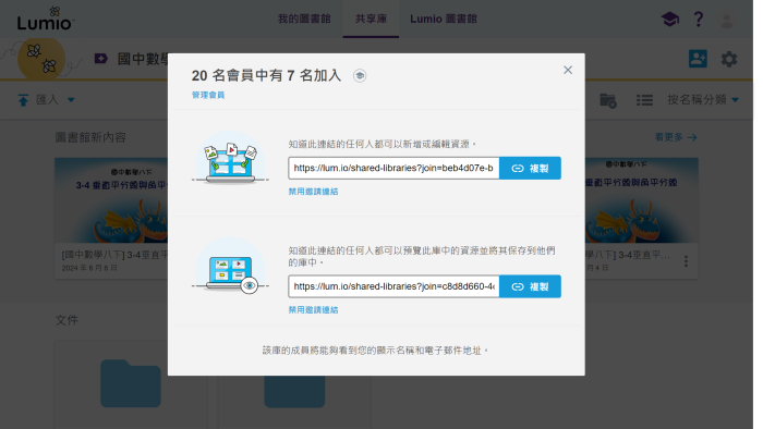 (2)共同編輯教材:Lumio Spark 雲端共編版支援最多五個共編資料夾,每個資料夾可容納最多20位一般使用者,這些使用者可以共同編輯該資料夾中的Lumio教材,實現教材的共同準備與設計。