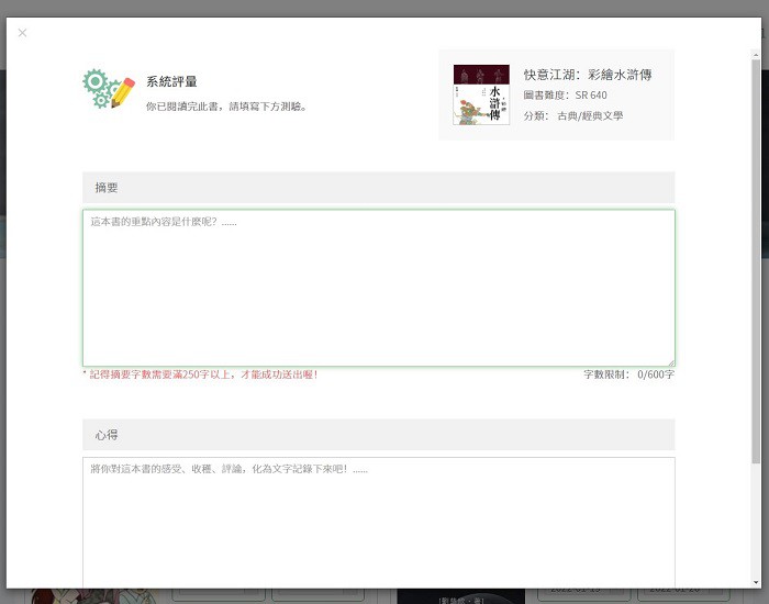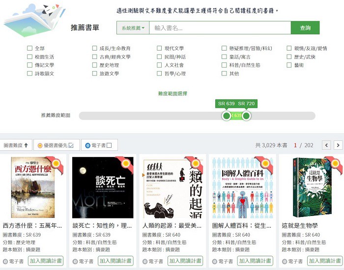 由CRIE的讀本分級的推薦書單,參與者可在閱讀後撰寫摘要心得,教學者透過自動批閱系統,作為學生閱讀計畫與理解能力的評鑑,以及應於於智慧閱讀教學活動課程設計的參考。