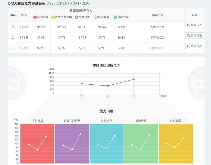 同時,並基於認知發展理論,將受測者的閱讀能力依照字詞辨識、表層文意理解、文意統整、推論理解、分析評鑑等5個向度作為分析項目。檢測後,電腦運用大數據進行同個年級的常模對照,分析出受測者實際的閱讀能力等級落點於哪個年級。其適用對象為中文母語使用者,小學二年級至高中三年級皆可使用。目前已累積超過13,000人次的測驗結果,涵蓋全國多所公私立、國際學校與實驗學校,而DACC檢測的結果亦為教育部認可之學習歷程證照。
