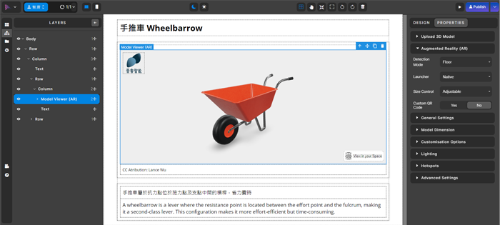 SwiftXR 的直覺介面和拖放功能,成為快速發布高品質 3D圖像、AR 和 VR 體驗的理想工具。使用者還可以生成網頁連結,方便分享和嵌入 XR 專案,極大提高了創作的靈活性和創造力。