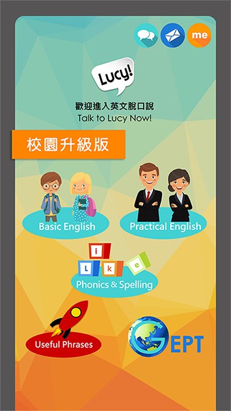 Talk to Lucy 英文脫口說是一套包含豐富課程內容,以語音互動方式,引導不同程度的使用者練習英語口說的應用。練習方式就像和外語教師一對一交談,佐以有趣的圖片和鼓勵回饋,讓使用者在互動中聆聽對話、跟讀句子、練習造句、應用對話,在完整的練習流程後,達至敢於開口、習慣聽說的成效。其間 AI 老師會糾正使用者的不良發音和用法錯誤,有效提高使用者的英語能力。