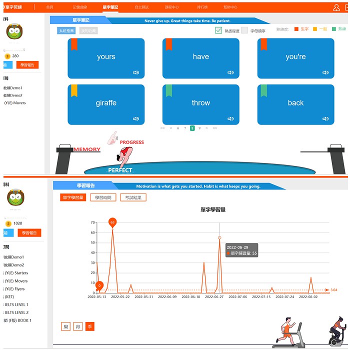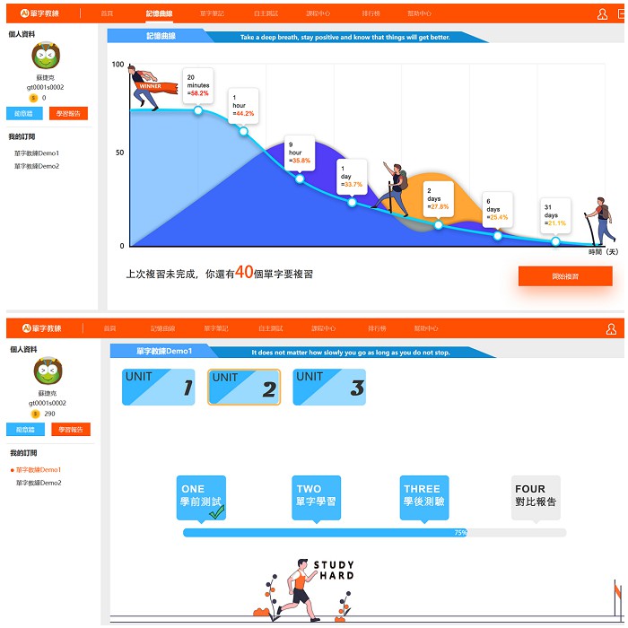 智能管理每個單元的學習進度、學習時間,及每個單字的記憶速度和記憶強度。