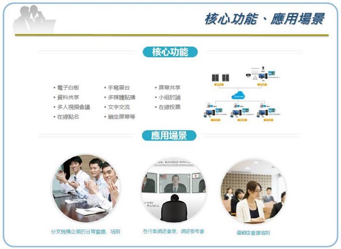 • 畫面分享:畫面內容(含影、音)高清畫質分享,順暢不停頓。電子白板:多種常用電子白板功能,直覺式介面,即點即用。