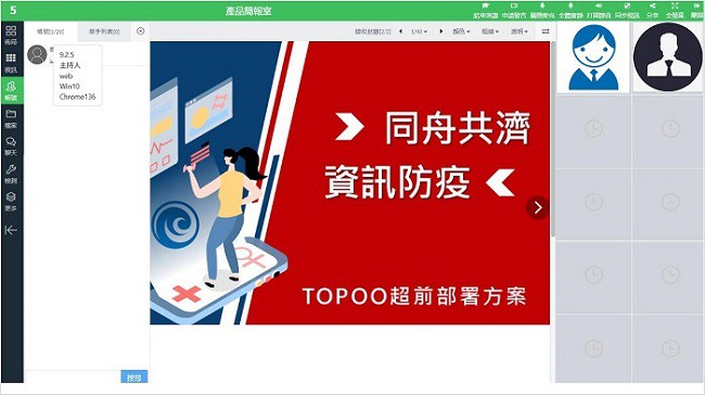 使用者不需要安裝軟體或外掛程式,可用電腦(筆電)平板、手機與瀏覽器(Chrome、Edge、Firefox、Safari)就可以使用「TOPMeeting」進行視訊會議,使用者端無需不定期更軟體版本,同時也能夠免受被網路攻擊的威脅。