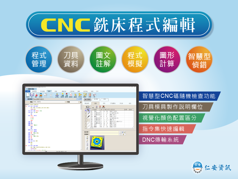 養成程式編寫能力與紮實的機械切削知識與加工座標概念。智慧型偵錯與詳細的路徑模擬,如同老師傅在旁協助學生找出程式碼錯誤的問題