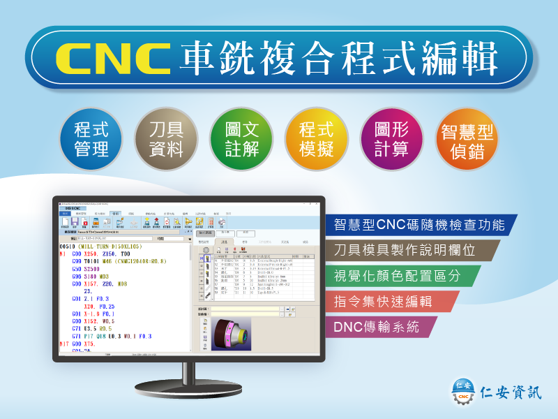 例: G碼為藍色,教學時能讓學生更清楚瞭解CNC程式結構及代碼的寫作方式。