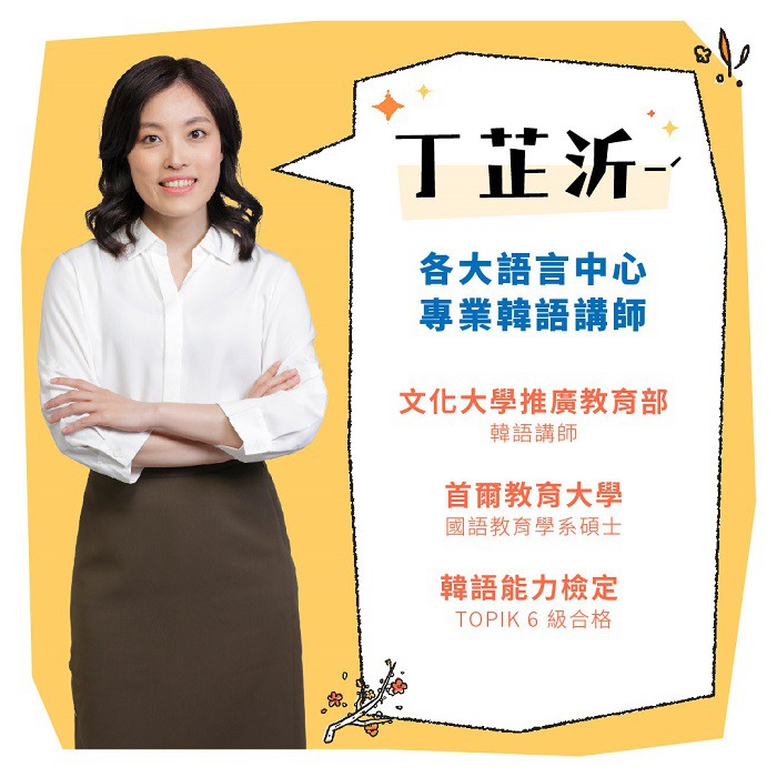 韓文老師丁芷沂!目前在文化大學推廣部擔任韓語講師,課堂上將透過自創的「比喻學習法」,讓你秒懂正確發音的嘴型以及舌頭擺放的位置,並直接點破那些不是韓文初學者也常犯的發音失誤!讓你不用死背發音規則,也能在不知不覺中說出道地韓文!期望透過此次課程,讓大家不再空耳、憑感覺,準確唸出每一個字、詞、句!