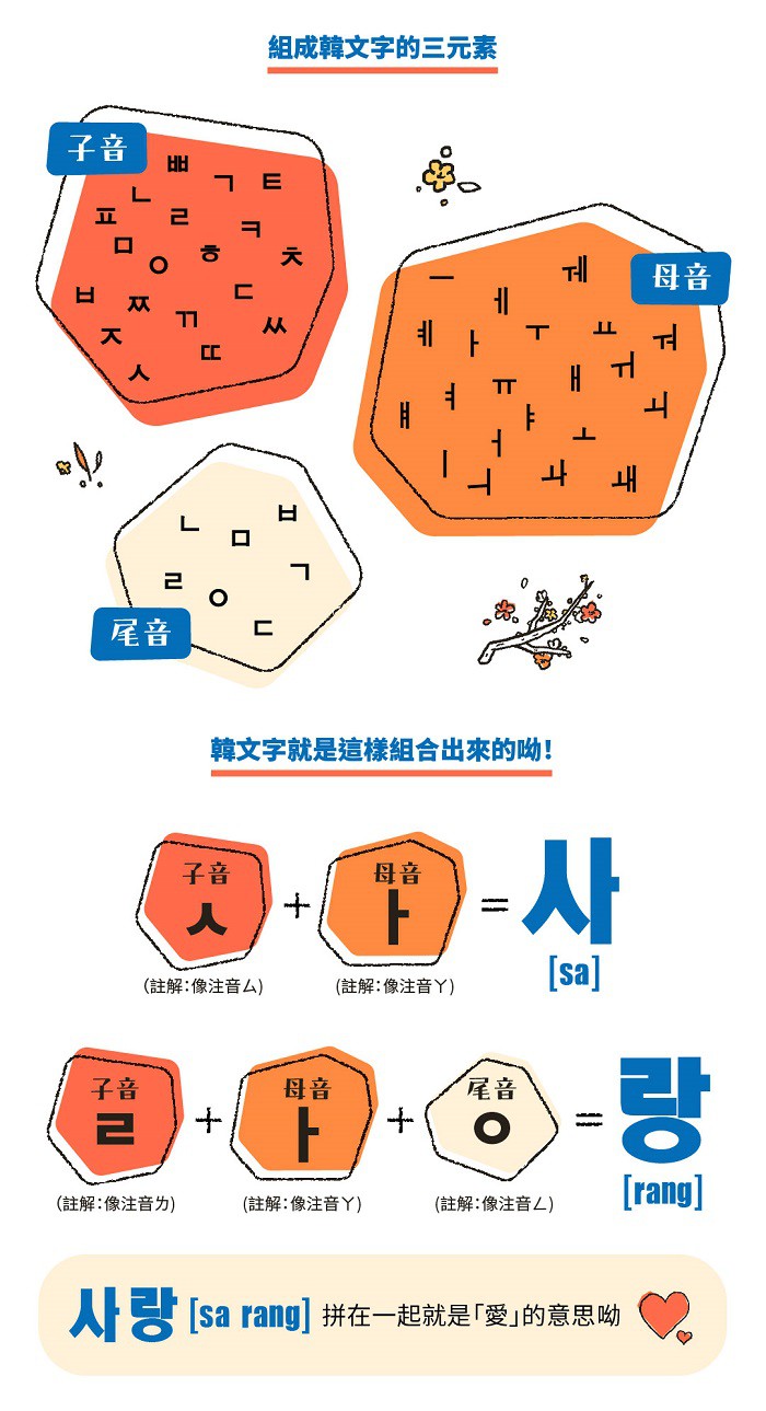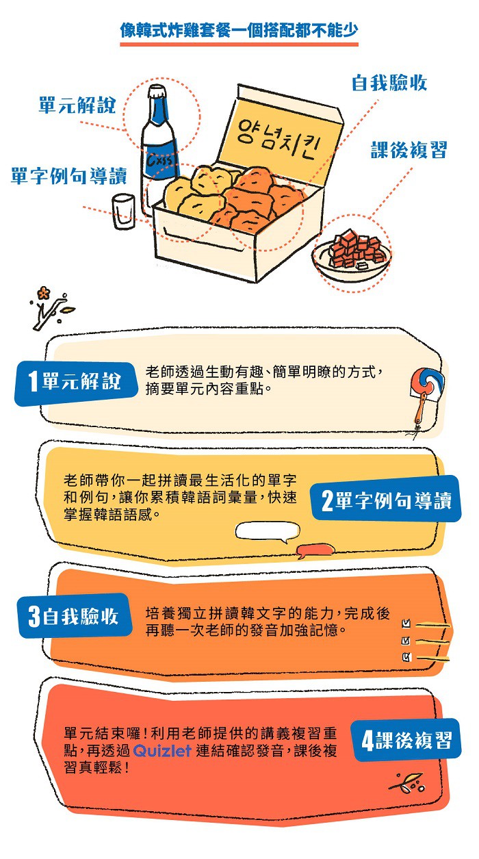 課程中將教你拆解「韓文文字結構」,韓文字分成三部分,子音、母音和尾音,只要放對位置,就可以拼出一個字囉!運用獨家「比喻學習法」,老師以自身學習經驗,透過「比喻學習法」,讓你秒懂正確發音的嘴型以及舌頭擺放位置!