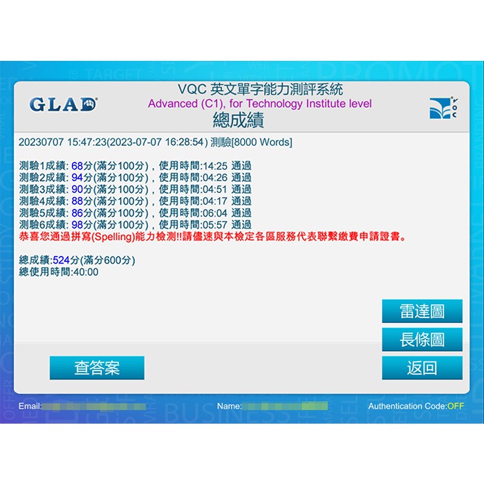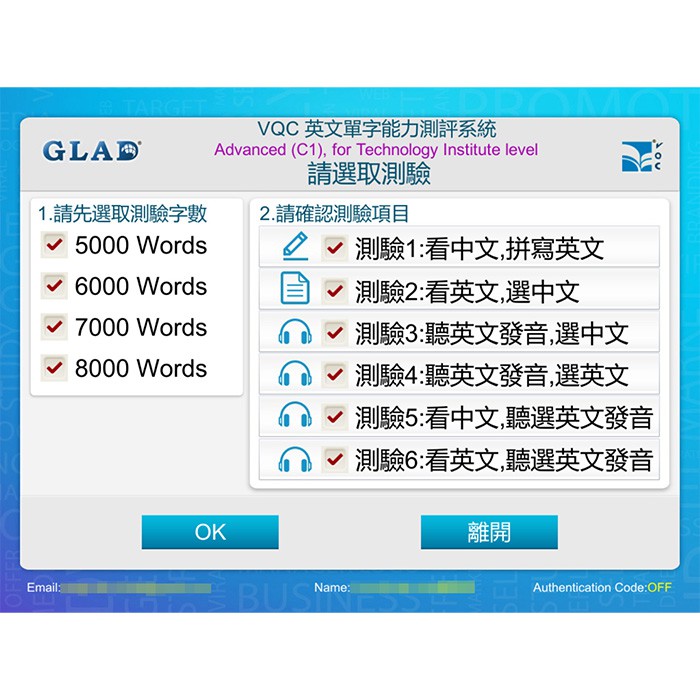 (2) 測驗題數:分為六種測驗,每種測驗100題,總題數600題