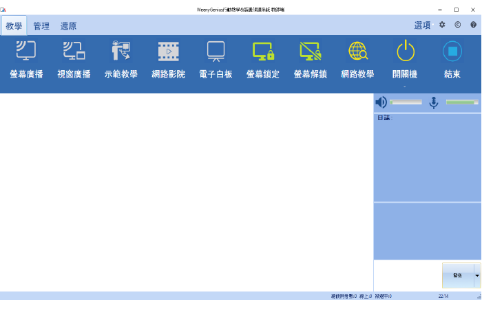 在行動裝置導入課堂教學的過程中,WeenyGenius (Premium版)作為教學輔助工具,提供多樣教學及管理功能,方便老師進行各種教學活動。除此之外,對於維護人員在裝置管理上的需求,WeenyGenius (Premium版) 亦提供「系統還原」、「網路對拷」等功能,透過教師端裝置即可對所有學生端統一下達指令,大幅減輕維護人員的工作量。