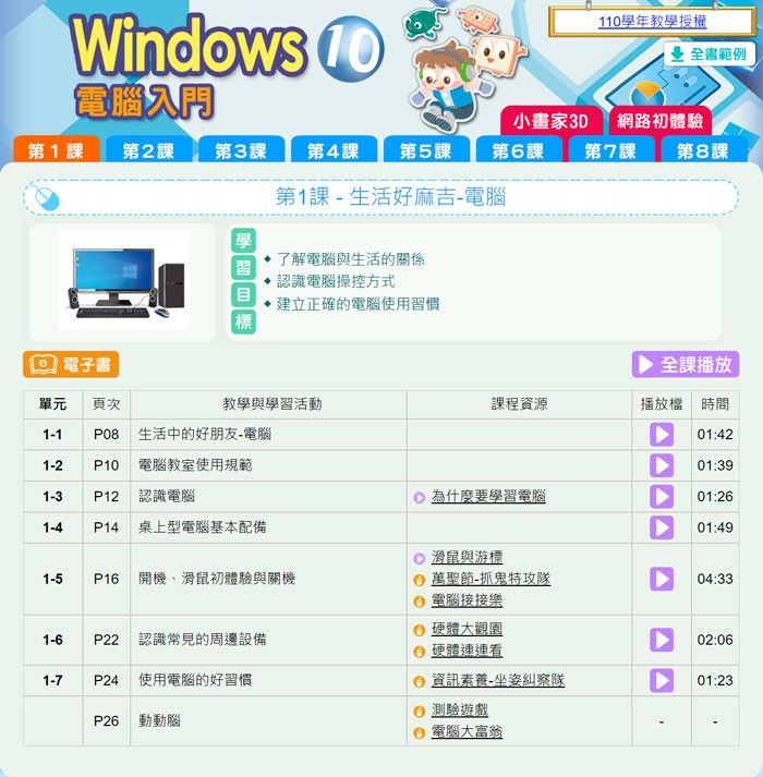 從電腦在我們生活中的應用概念開始,到認識電腦及其週邊的硬體設施,並瞭解如何操控、正確的使用習慣及觀念,讓小朋友能夠正確的開始建構資訊科技的能力。