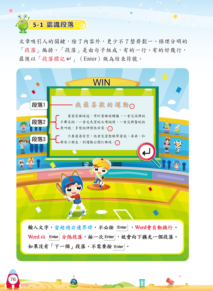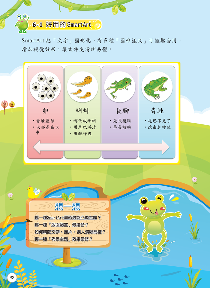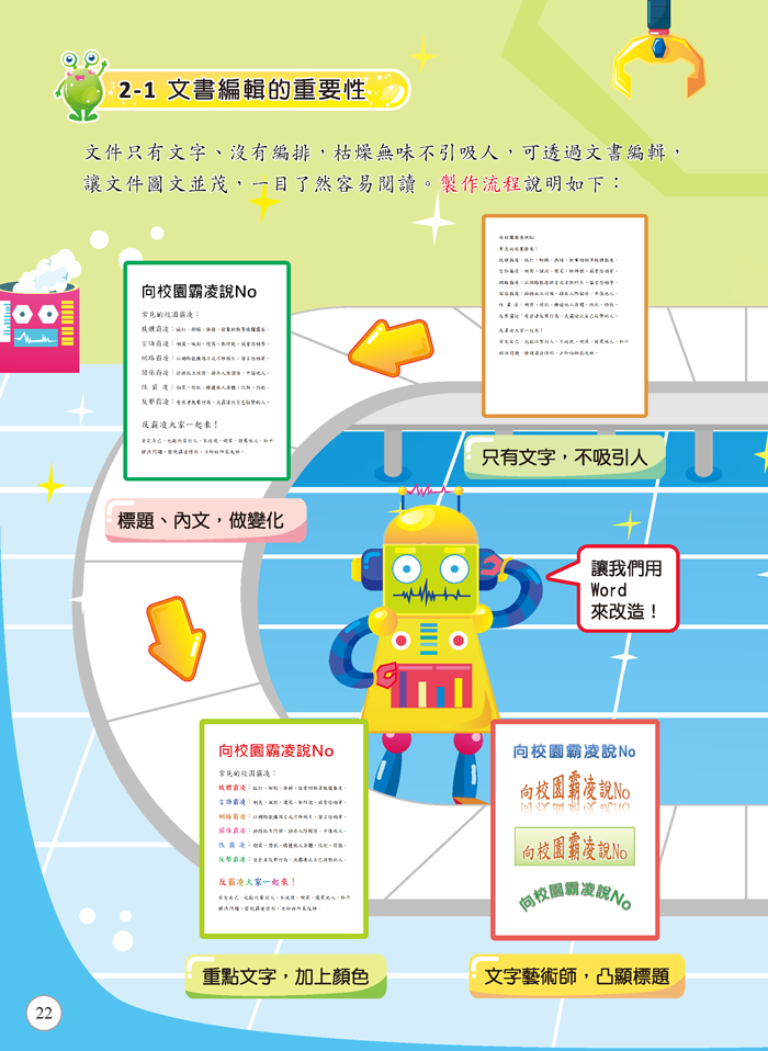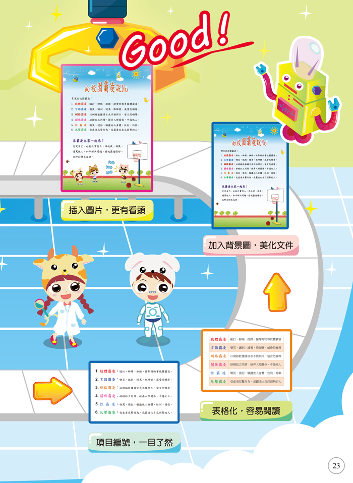 以「資訊倫理上網守則、我的功課表」串連學習、應用表格各項功能。進而學習段落縮排、對齊技巧,文繞圖和頁面框線;以及運用SmartArt,建立圖形化的文字視覺效果。