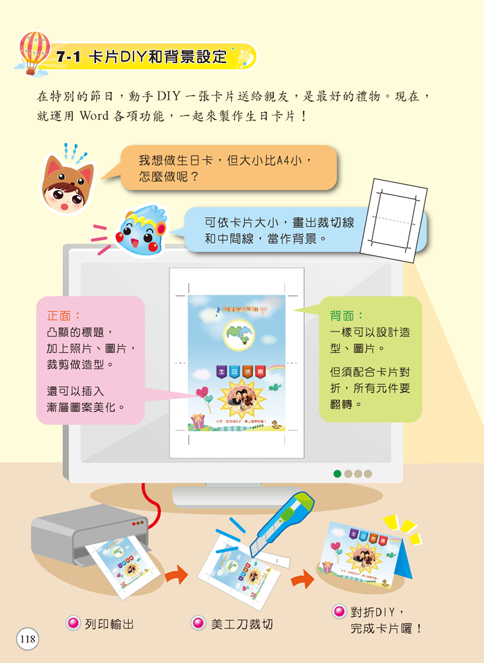 應用Word各項功能,動手DIY各種對折卡片,實踐創客精神。最後,善用網路找資料,用Word寫報告(長文件),包括「版面配置、封面、統一標題和內文格式、頁碼、分頁符號」等,再轉成PDF電子檔,動手做成小冊子。