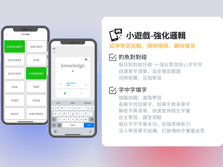 多種遊戲化複習方式 (單字卡/聽音拼字/雙單字/字中字/字首根尾/配對)