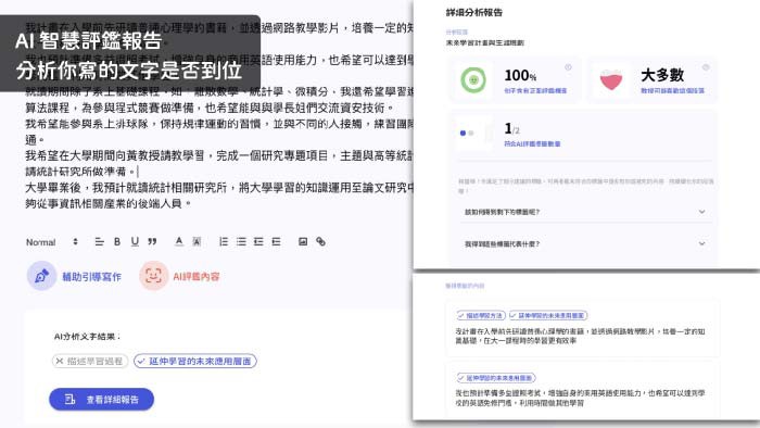 b. 系統分析學生文字內容,給予修正指標建議與進階優化報告,幫助學生隨寫隨測、越寫越好,降低老師重複指導工作的負擔。