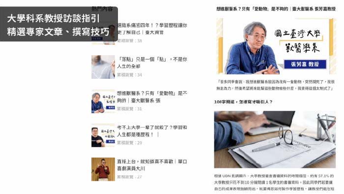 由專業內容團隊製作之學習歷程與探索相關優質文章和影音,豐富學生視野。包含全臺各學群教授訪談、學習歷程撰寫技巧、個人成長與探索內容。